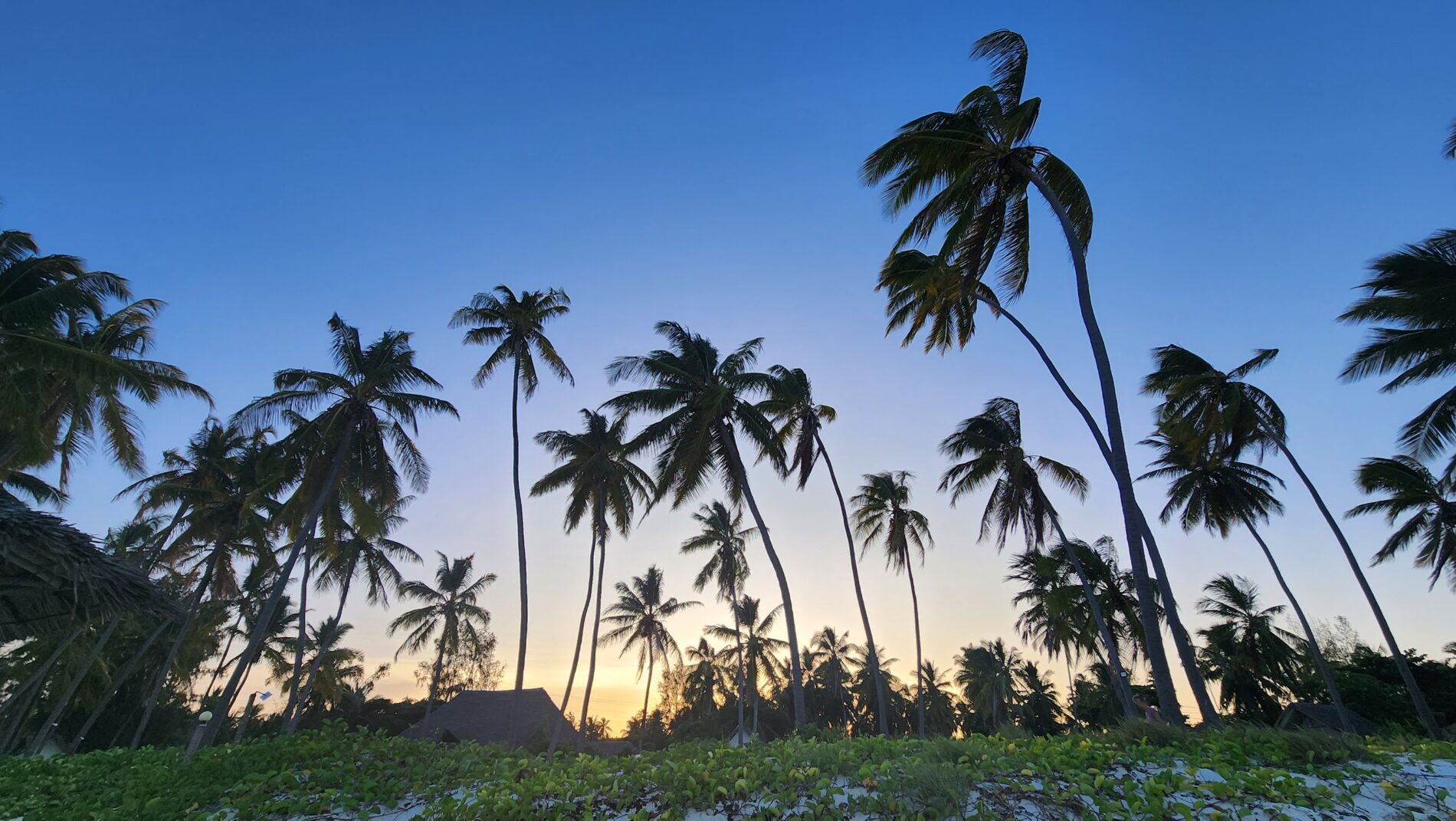 Detour Africa Tours and Safaris Tall palm trees line coastline of Zanzibar beach at dusk.